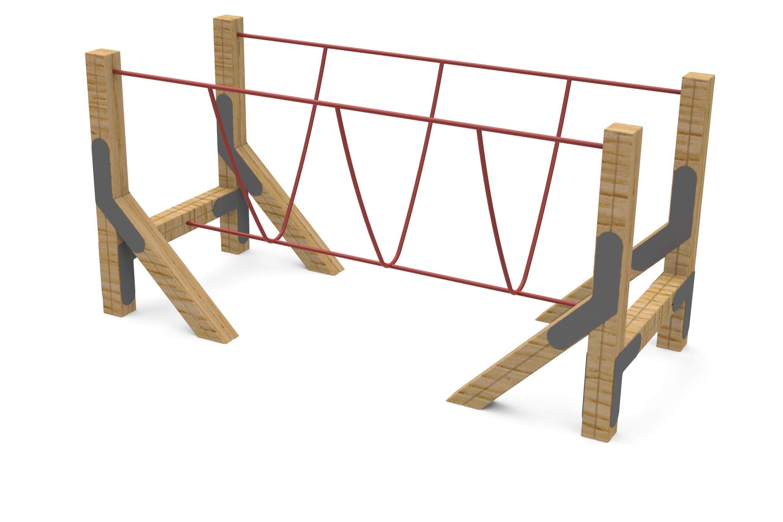 – Estructura de madera laminada de sección trébol de 90×90 mm con elementos de unión en chapa metálica con recubrimiento de polvo.