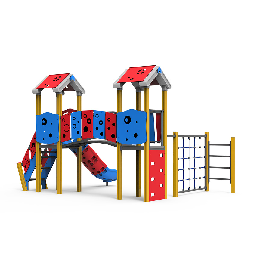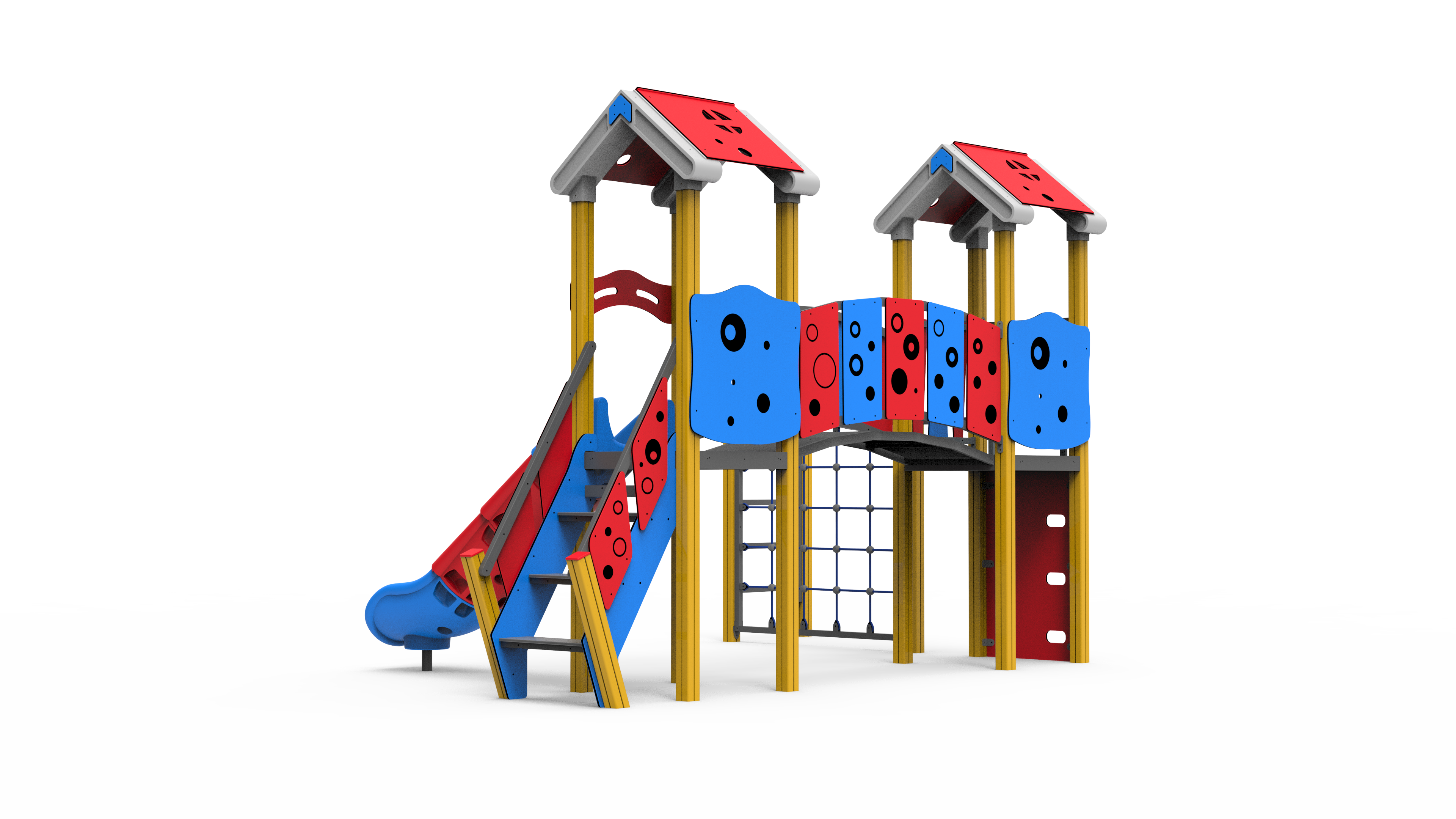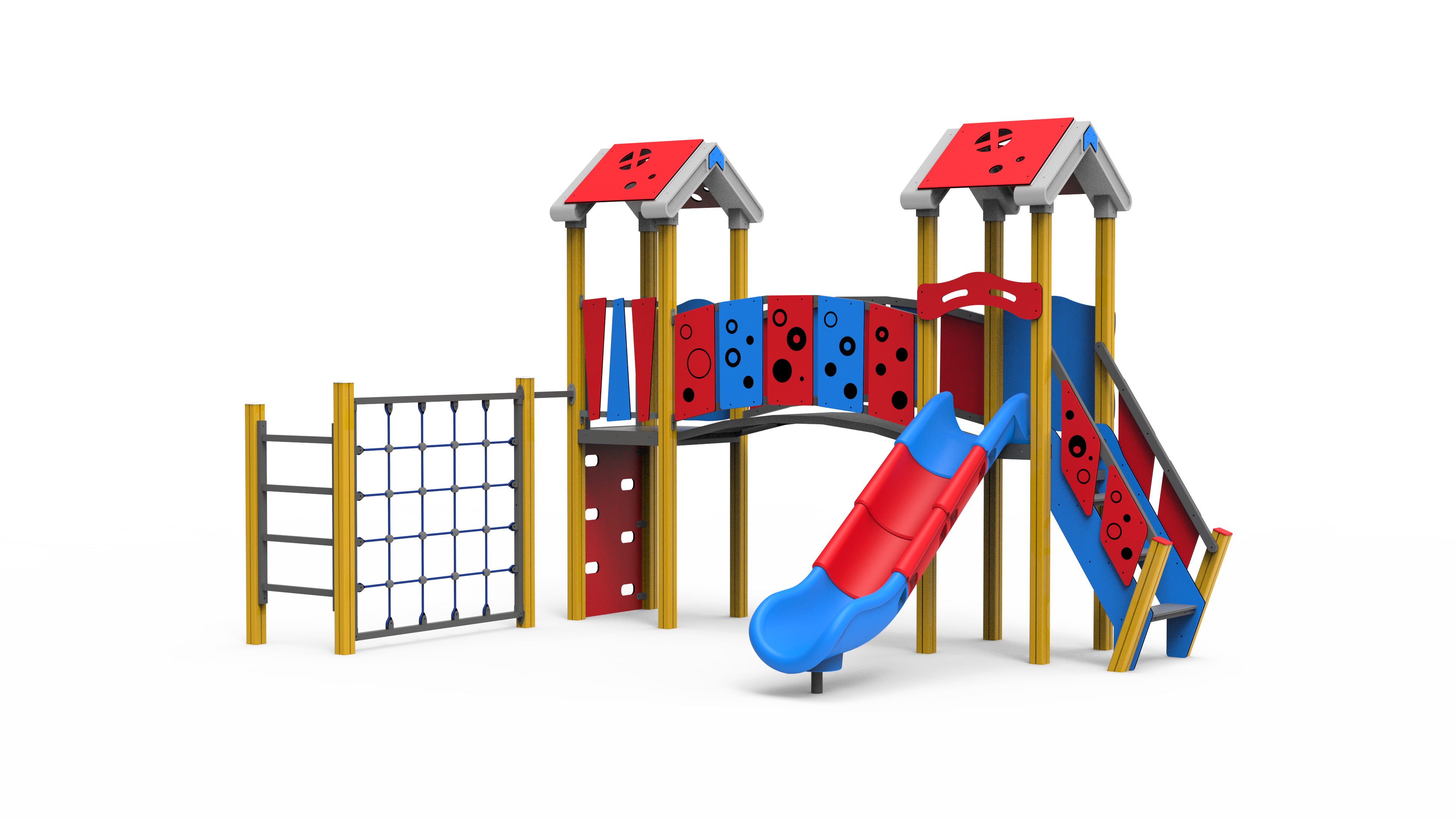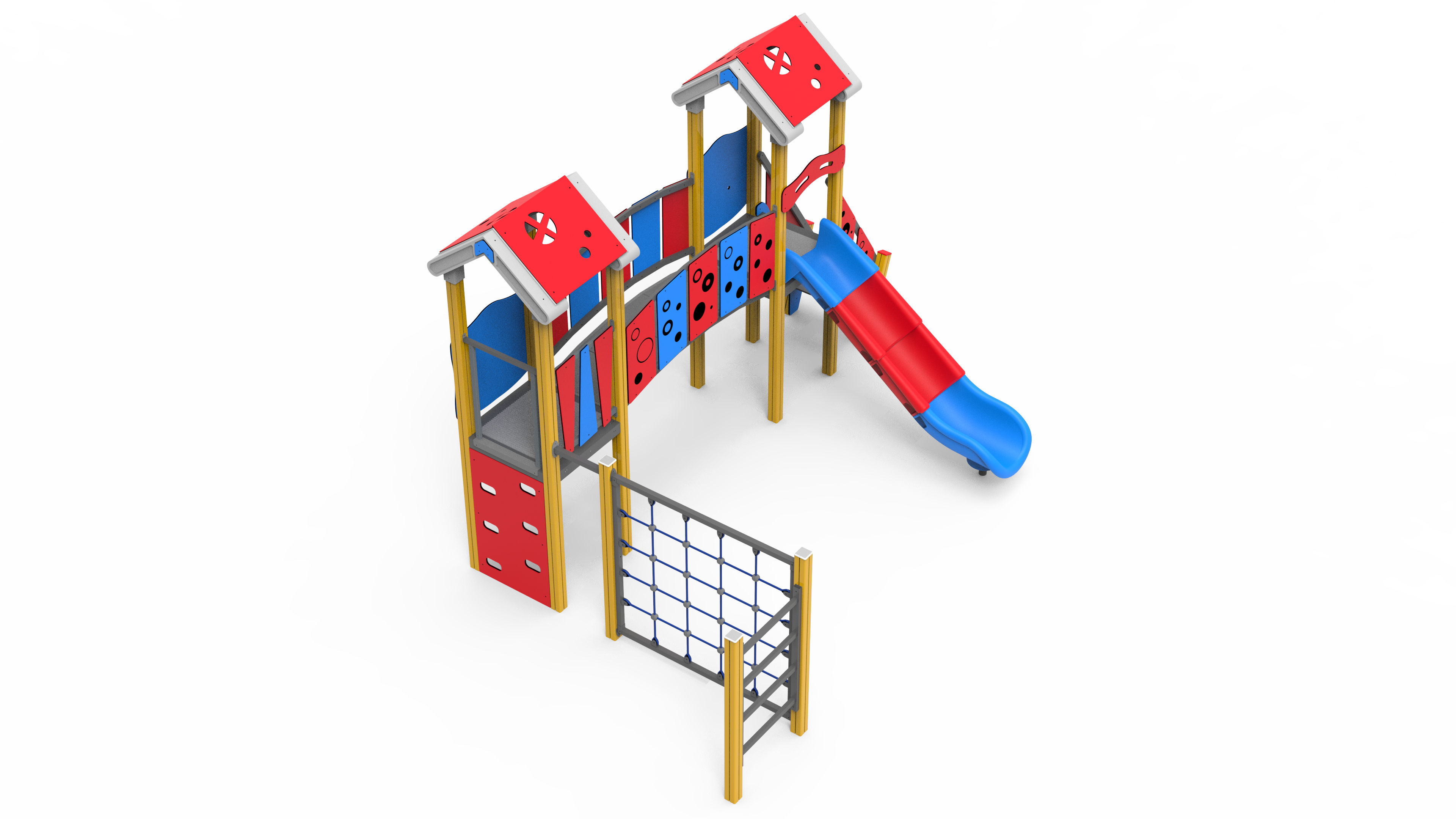 • Multijuego con dos torres y red de trepa incorporada. Con un tobogán de bajada, escalera con barandas incluida. Con rocódromo de acceso.