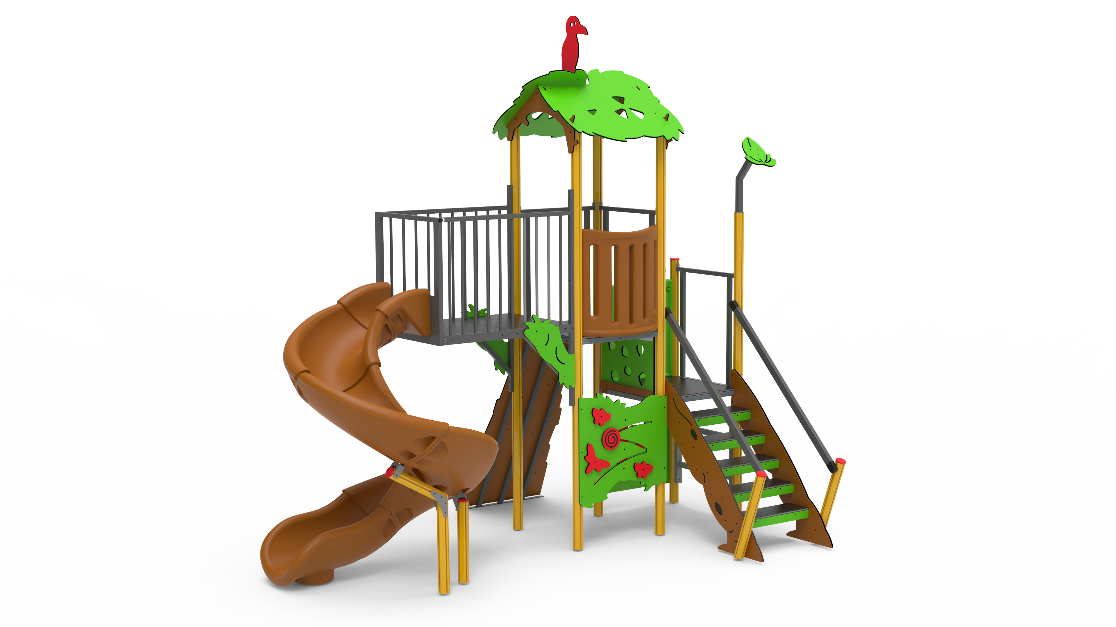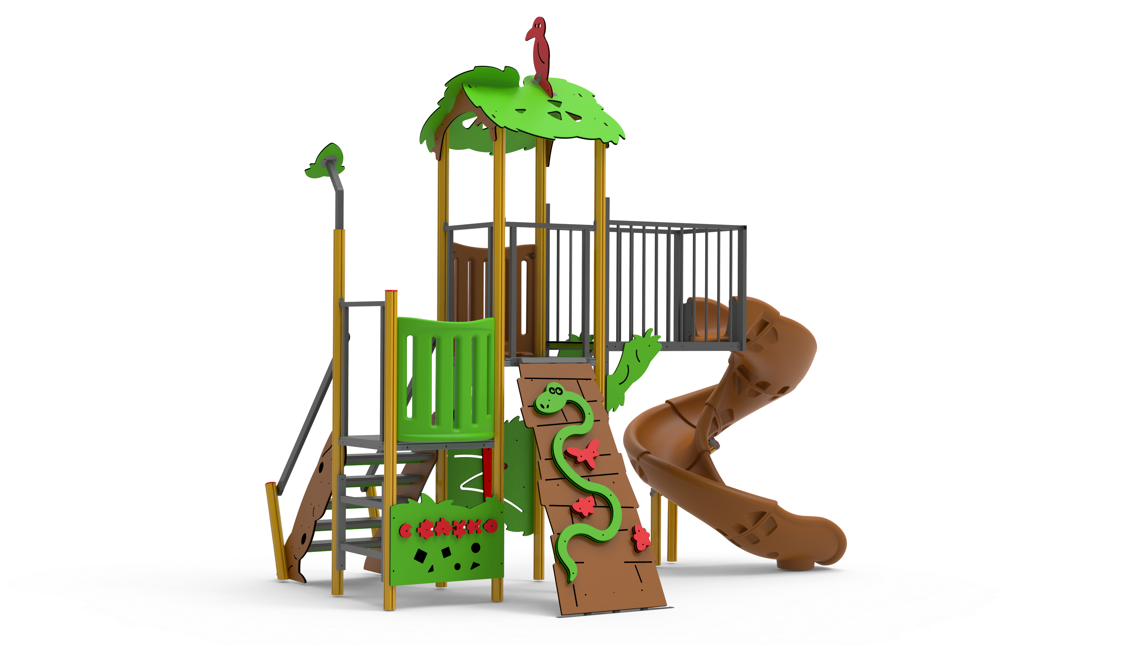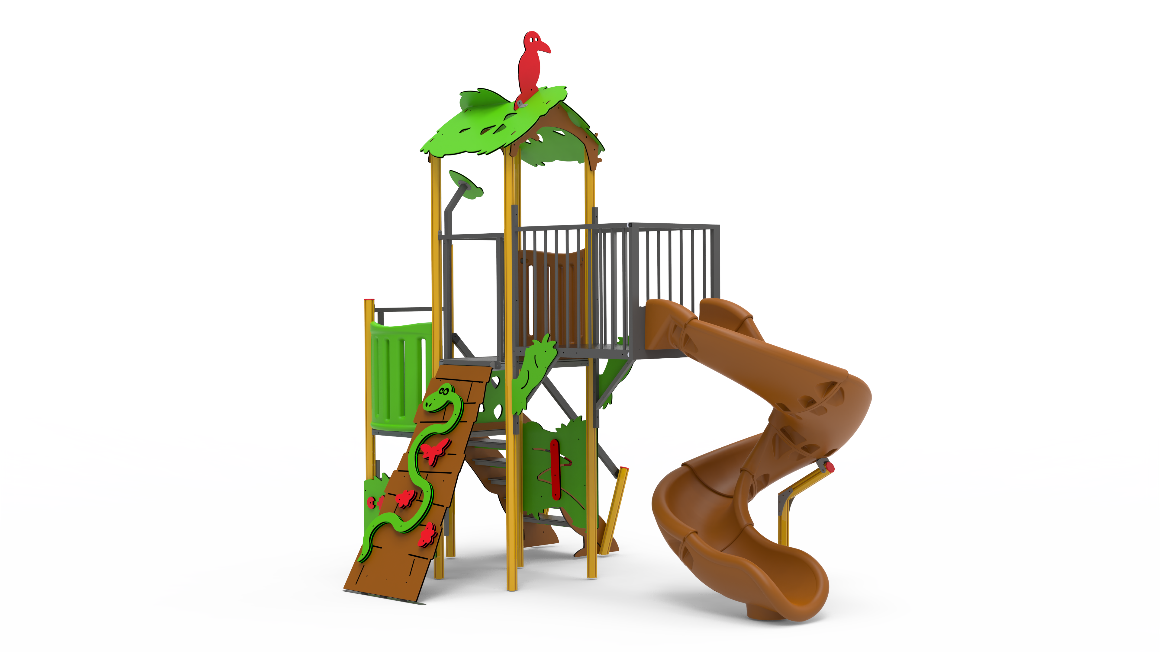 • Multijuego de varias plataformas de temática safari. Con acceso rocódromo personalizado, tobogán en espiral de bajada y escalera.