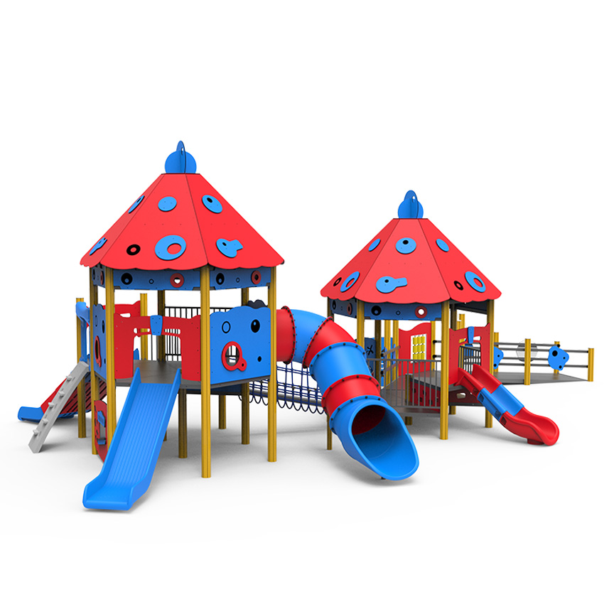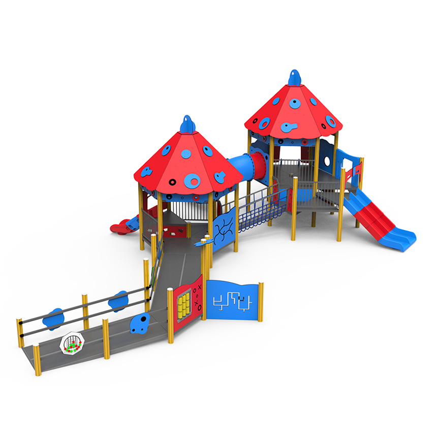 - Juego inclusivo con tobogán, rampa y diferentes elementos interactivos.
