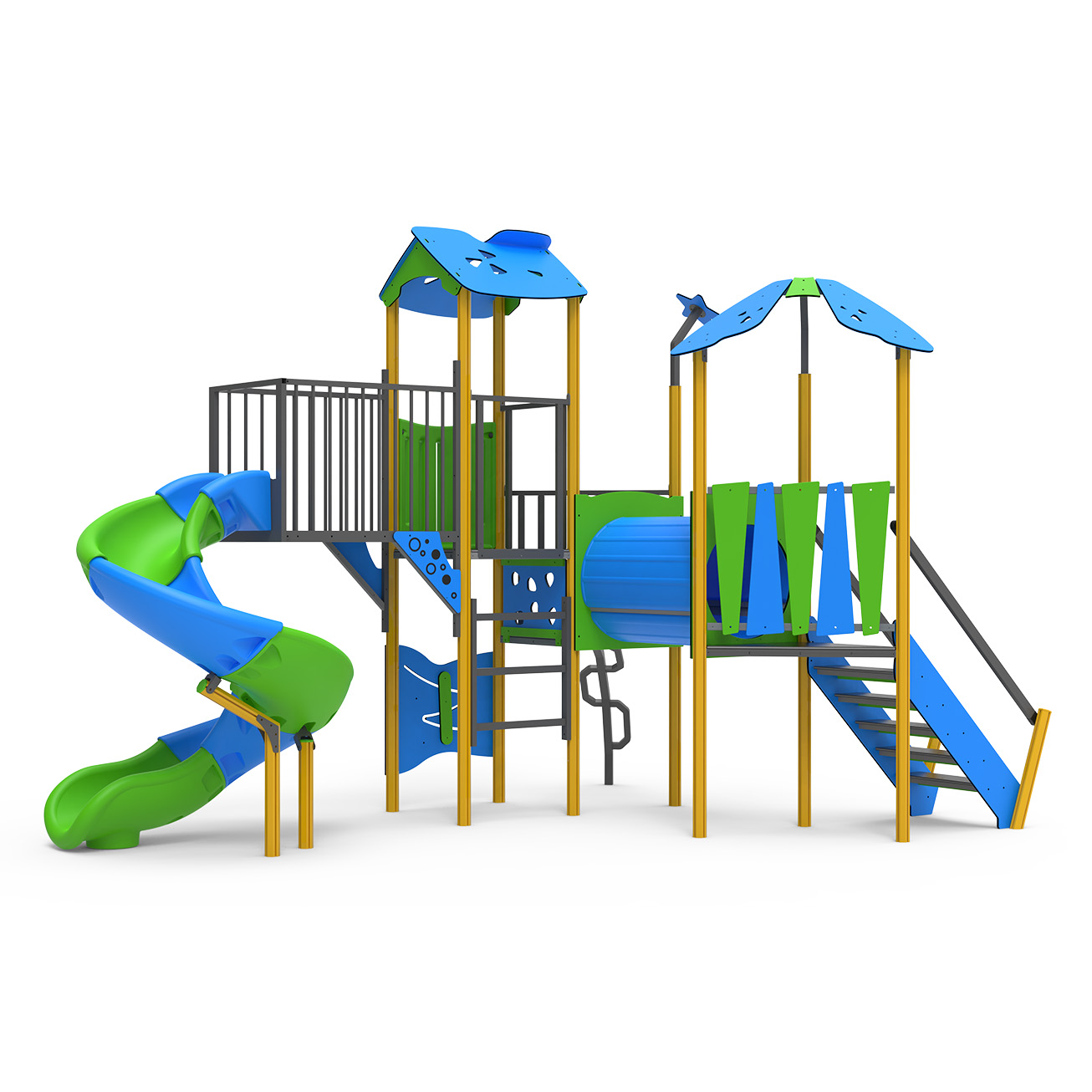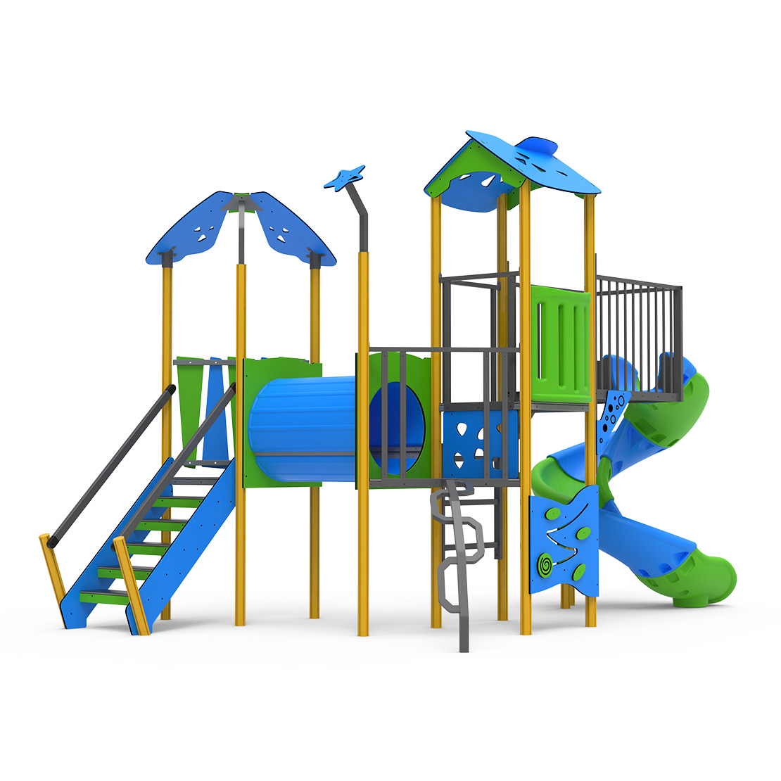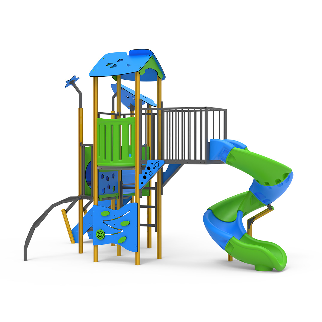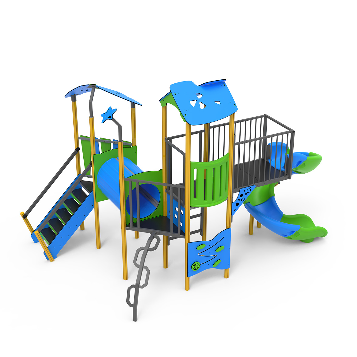 • Multijuego de varias plataformas con un tobogán tubular abierto. Incorporar un puente tubo y con escaleras de equilibrios y con barandas.
