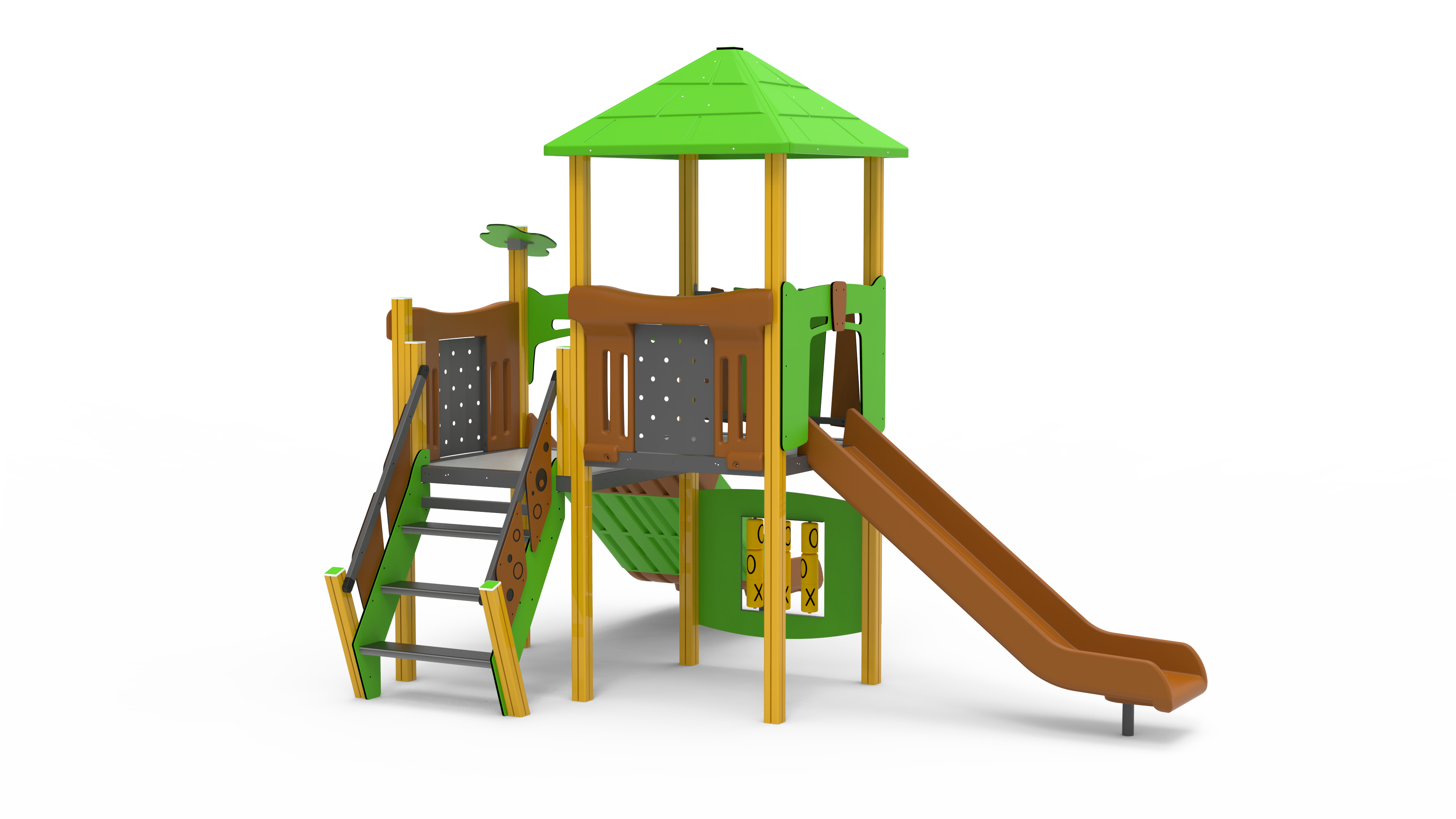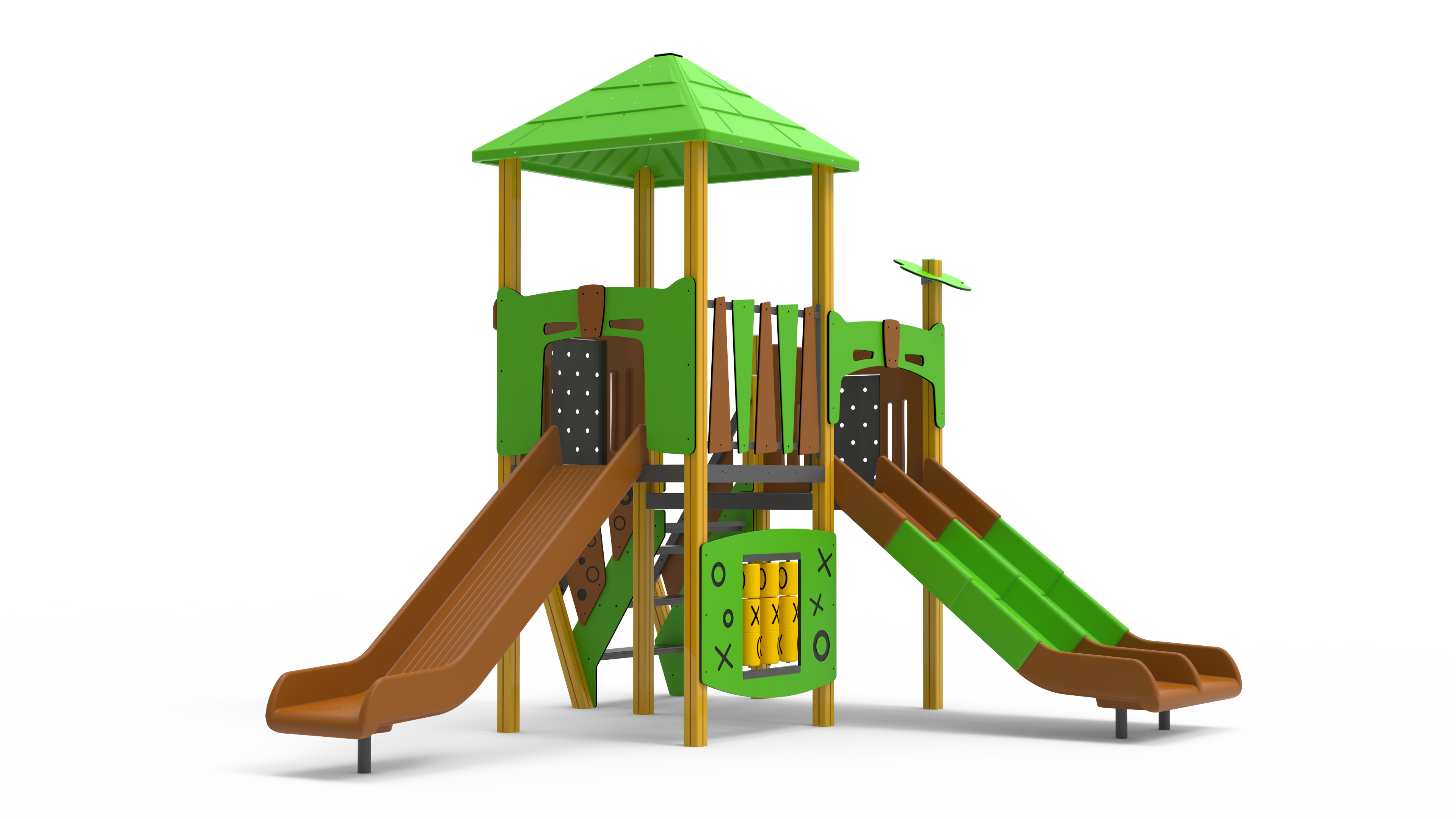 • Juego con dos plataformas de gran tamaño unidas. Incorpora un tobogán simple y un tobogán doble. Con una escalera de acceso de peldaños y barandas. Incluye un juego del tres en raya.
